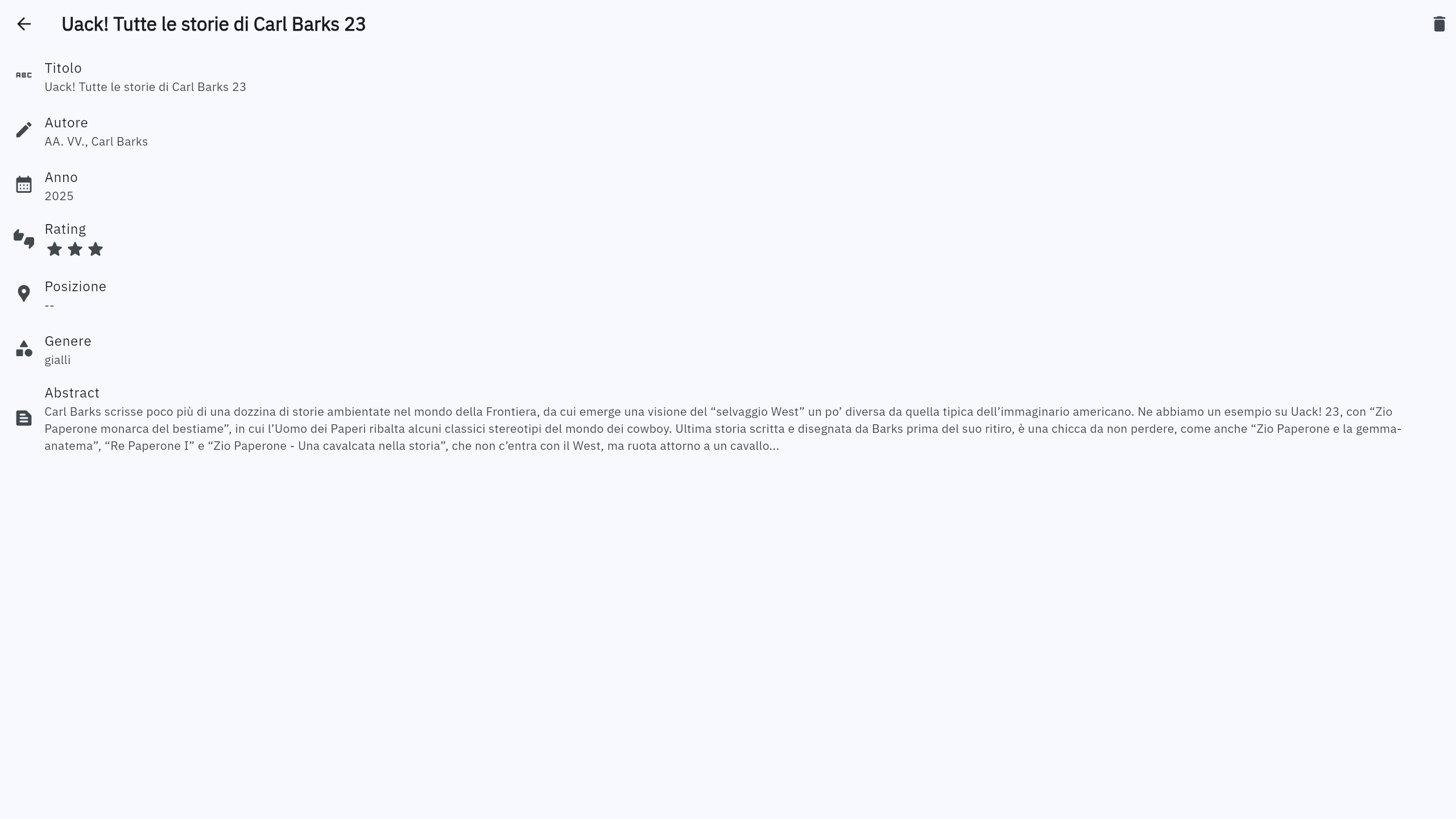 Monitoraggio della posizione: Assegna la posizione ai tuoi libri, sugli scaffali, in prestito o imballati. Ordina per posizione per trovare facilmente libri specifici o identificare quelli smarriti.